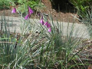 In the still, hot days of July or August a special treat awaits. Behold Dierama pulcherrimum with stalks so slender that even on a calm day there is continual movement. The delicate stems held high above the foliage droop with the weight of the pink flower panicle. Clumps of fine, grey-green blades support several flower stalks. A hardy perennial, this plant is eye catching alone or in groups.